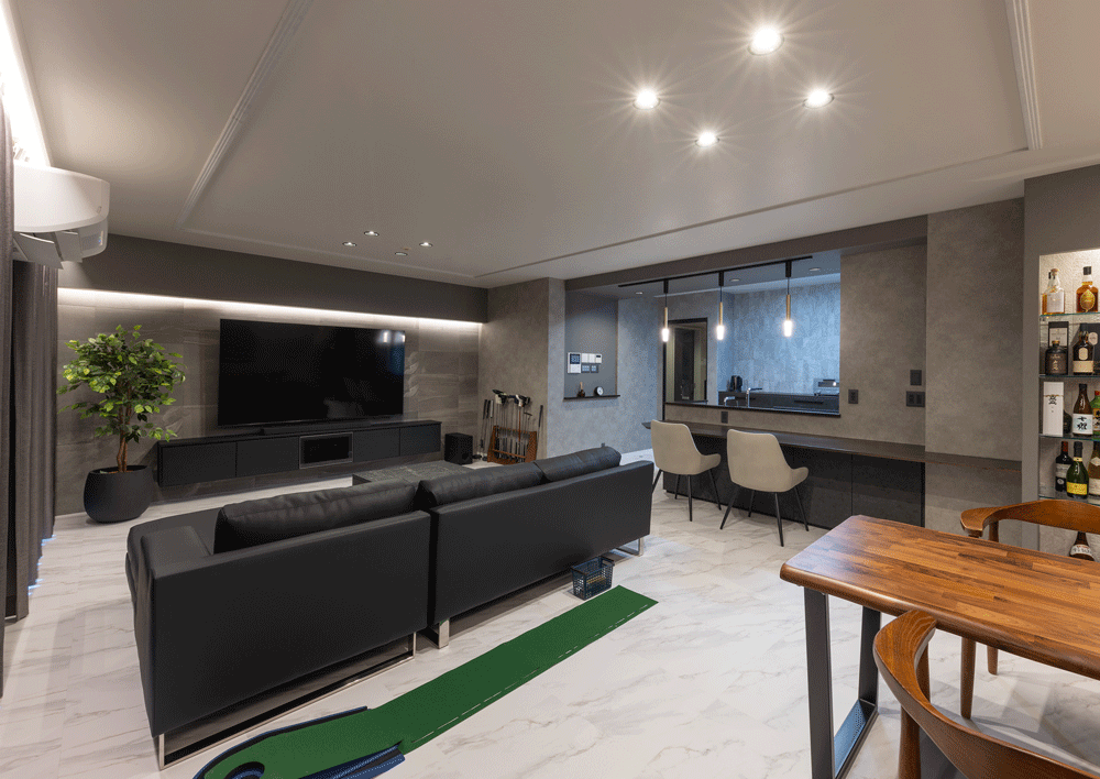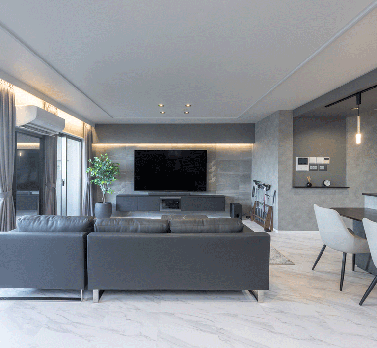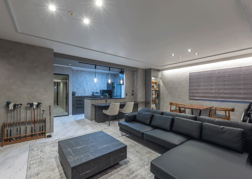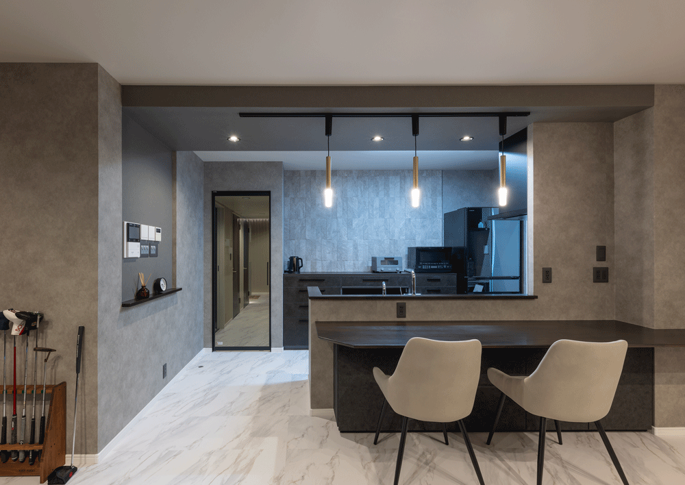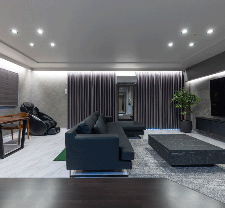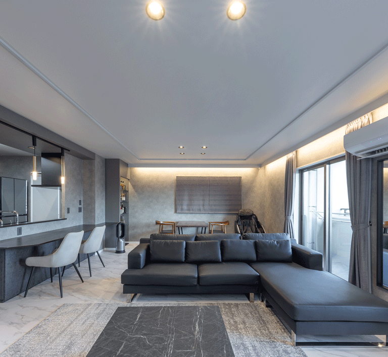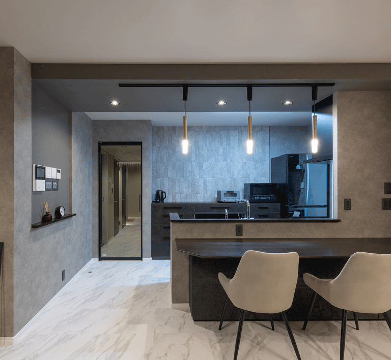 マンションのリノベーションに携わらせていただきました。 お客様のご意向で”ホテルライク”をコンセプトに、全体的な色みは濃い木目とグレー。それを照らす間接照明は高級感をより引き立てます。