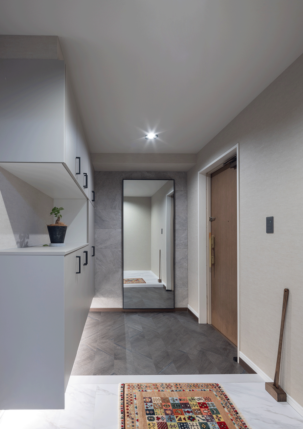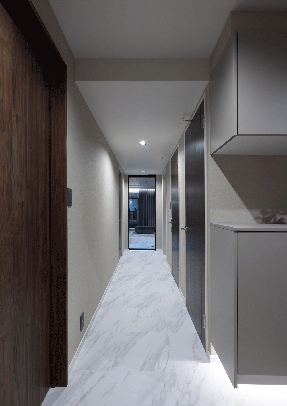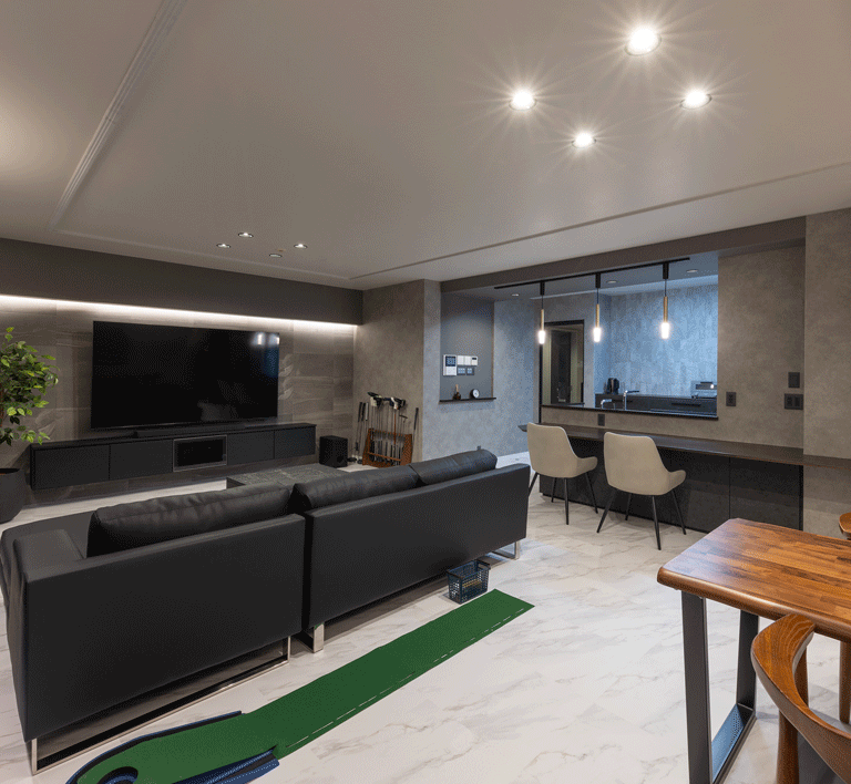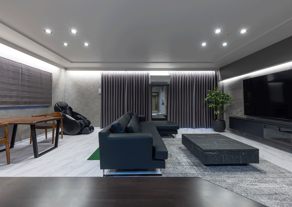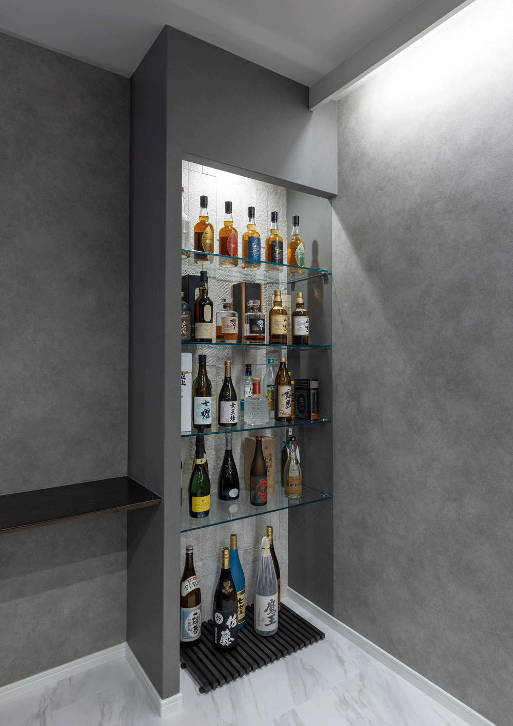マンションのリノベーションに携わらせていただきました。 お客様のご意向で”ホテルライク”をコンセプトに、全体的な色みは濃い木目とグレー。それを照らす間接照明は高級感をより引き立てます。